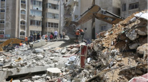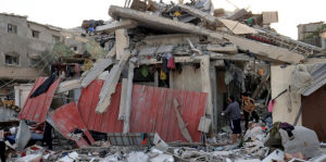 Palestinians look through the rubble of a building following Israeli bombardment of Khan Yunis in the southern Gaza Strip